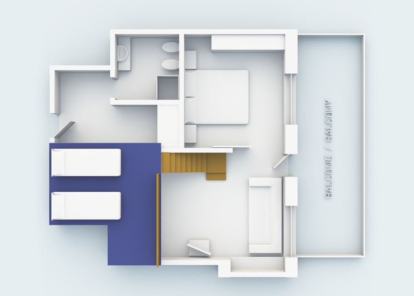 Appartamento composto da quattro vani su due livelli: camera con un letto matrimoniale o con due letti singoli su richiesta, camera ceca con letto singolo, soppalco con due letti singoli, soggiorno con divano letto matrimoniale, tavolo, piccolo angolo cottura attrezzato e con induzione, bagno con doccia, balcone attrezzato con tavolo e sedie.